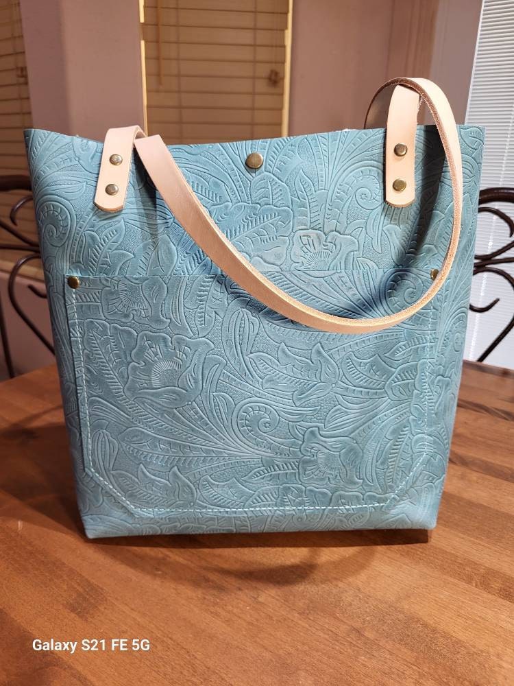 These beautiful totes are one of a kind timeless classics. They are all made with 100% genuine leather ranging from 3-5 oz. All exterior seams are double stitched, and the outside and inside pockets are hand stitched. The small tote measures approx. 13" across the top and 10" across the bottom. The medium tote measures approx. 15" across the top and 10.5" across the bottom. The large tote measures approx. 18" across the top and 11" across the bottom. The extra large tote measures approx. 21" across the top and 13.5" across the bottom. All size totes have an approx. 11" handle drop. You can pick your bag color, bag size, handle color and fastener color.