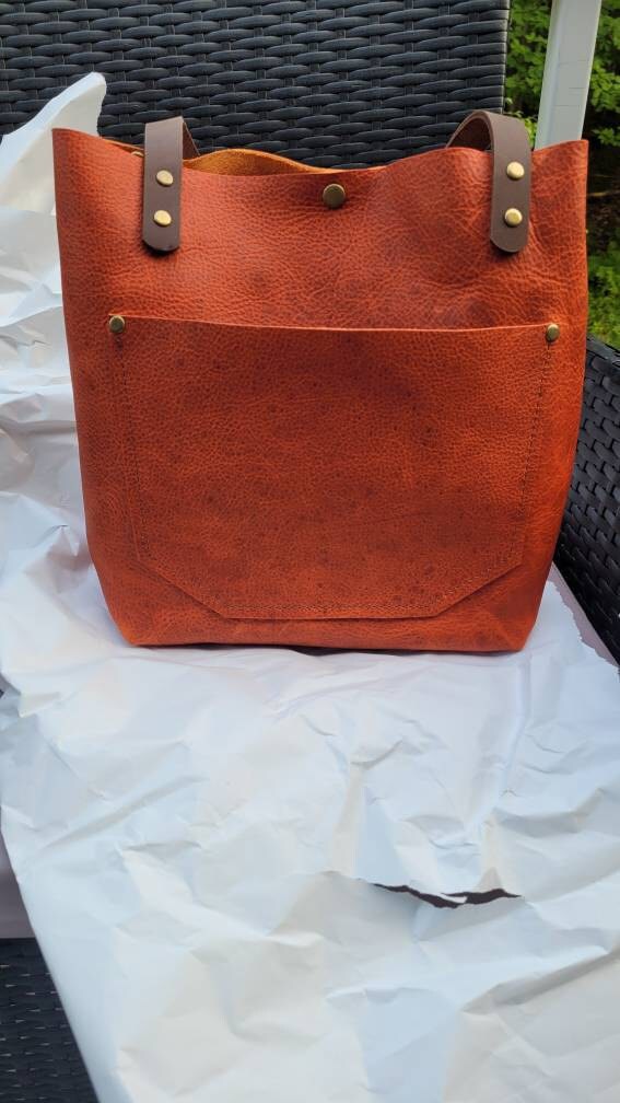 These beautiful totes are one of a kind timeless classics with cross body d-rings (crossbody strap not included). They are all made with 100% genuine leather ranging from 3-5 oz. All exterior seams are double stitched, and the outside and inside pockets are hand stitched. The small tote measures approx. 13" across the top, 10" across the bottom and approx 11.5” tall. The medium tote measures approx. 15" across the top, 10.5" across the bottom and approx. 12” tall. The large tote measures approx. 18" across the top, 11" across the bottom and approx. 12” tall. The extra large tote measures approx. 21" across the top, 13.5" across the bottom and approx. 13” tall. All size totes have an approx. 11" handle drop. You can pick your bag color, bag size, handle color and fastener color.