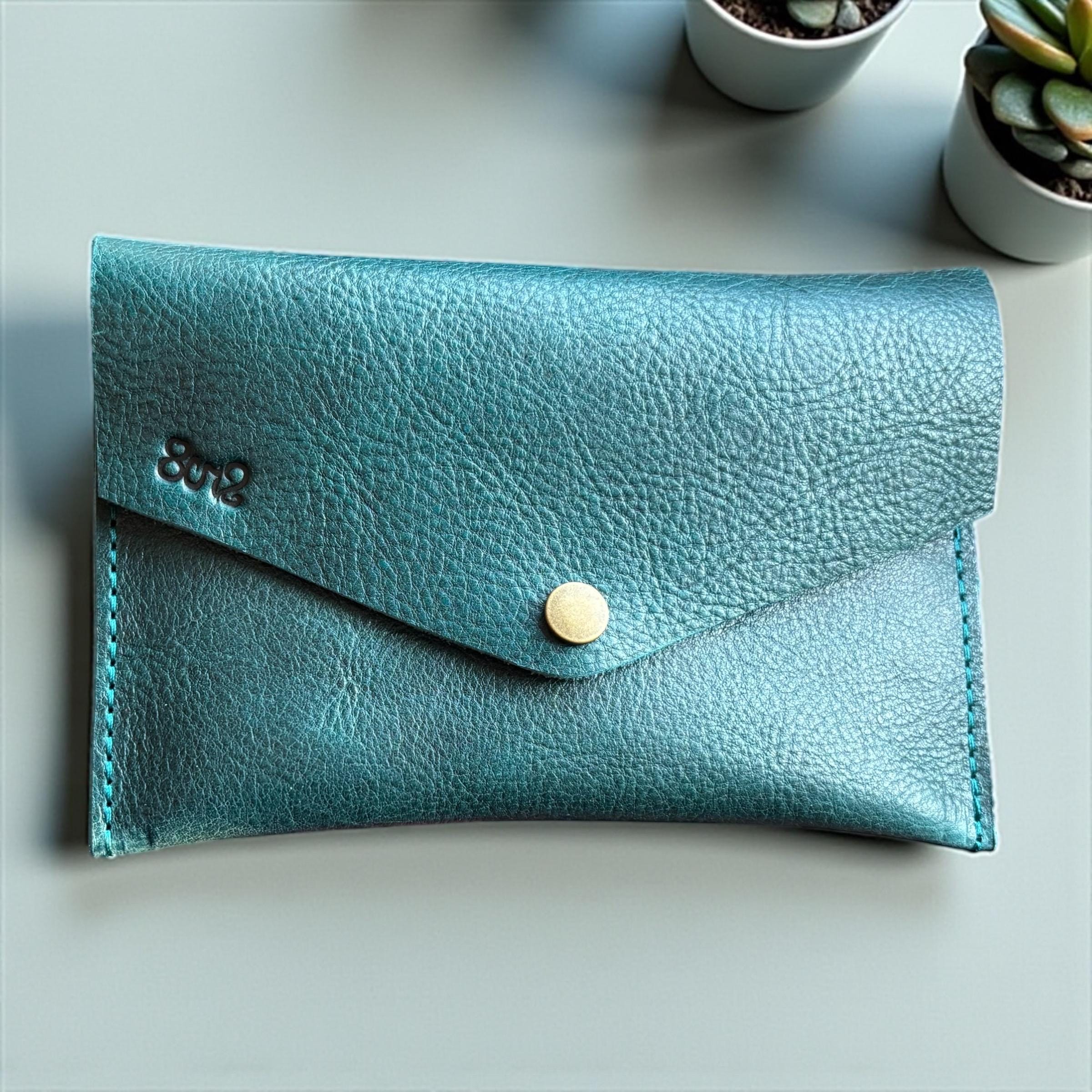 These beautiful full grain authentic leather Envelope Pouches are all made with 100% genuine leather ranging from 3-5 oz. They measure approx. 7” x 4 1/2”. You can choose an Antique Brass or a Gunmetal snap.