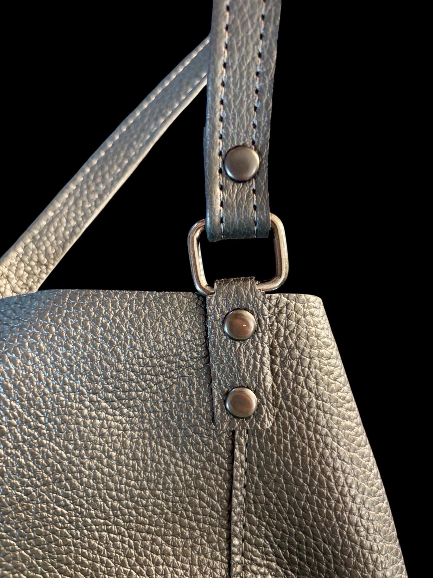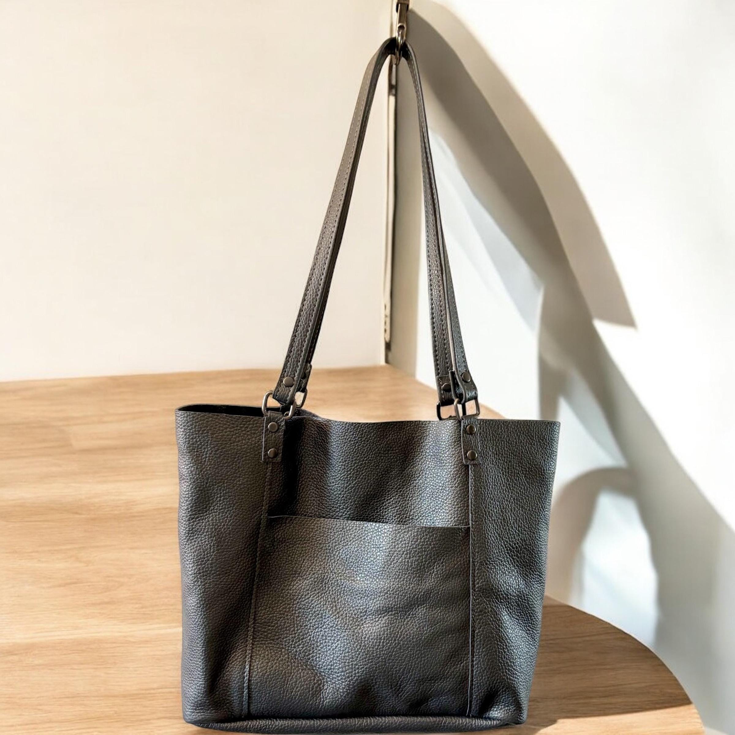These beautiful totes are one of a kind timeless classics. They are all made with 100% genuine leather ranging from 3-5 oz. With an outside pocket, an inside pocket and trendy rectangle d-rings holding the shoulder straps the Bazzar Tote is a one of a kind tote bag. All exterior seams are double stitched. The Bazzar measures approx. 11” tall, approx. 12” wide and approx. 4” depth and an approx. 11” strap drop. You can pick your bag color and hardware color.