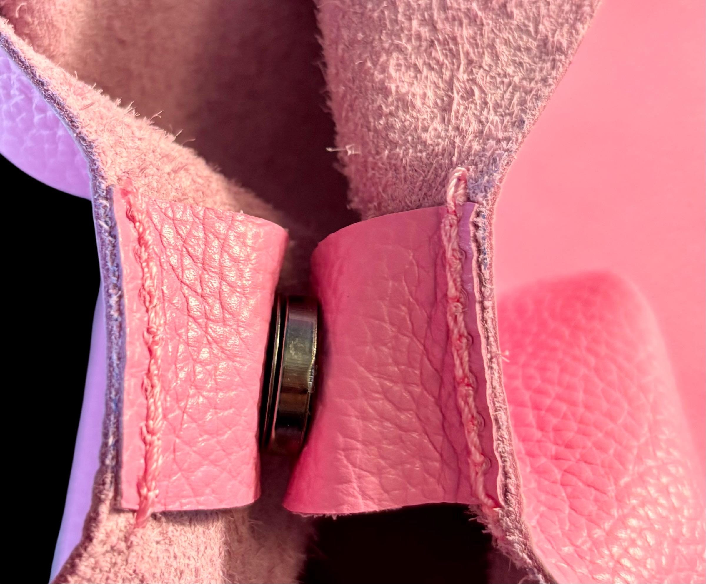 These beautiful totes are one of a kind timeless classics. They are all made with 100% genuine leather ranging from 3-5 oz. With 2 outside pockets and trendy rectangle d-rings holding the shoulder straps and a unique wavy top, the Kahuna is a one of a kind tote bag. All exterior seams are double stitched. The Kahuna measures approx. 10” tall, approx. 20” wide with the sides pulled tight and approx. 12” wide when the sides are in the resting position, approx. 5 1/2” depth and an approx. 14” strap drop. You can pick your bag color, handle color and hardware color.