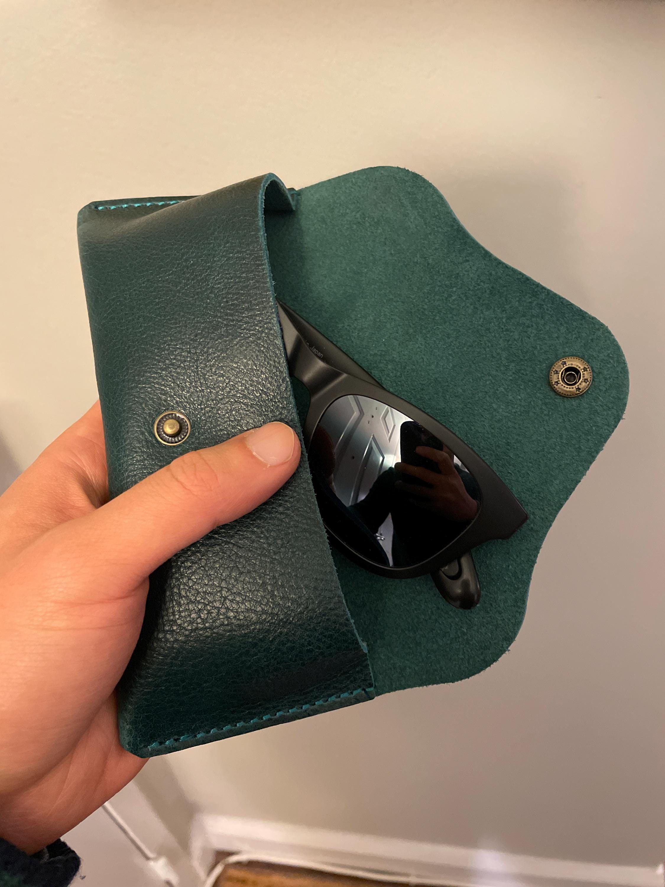Authentic 100% Real Leather Sunglass/Glass Case. Made in the USA! Choose your leather color and hardware color. It is approx. 7” wide, approx. 3” tall and has a depth of approx. 1.5” with a snap closure to keep your glasses and sunglasses secure!