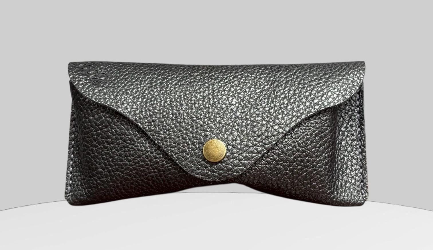 Authentic 100% Full Grain Leather Sunglass/Glass Case. Made in the USA! Choose your leather color and hardware color. It is approx. 7” wide, approx. 3” tall and has a depth of approx. 1.5” with a snap closure to keep your glasses and sunglasses secure!