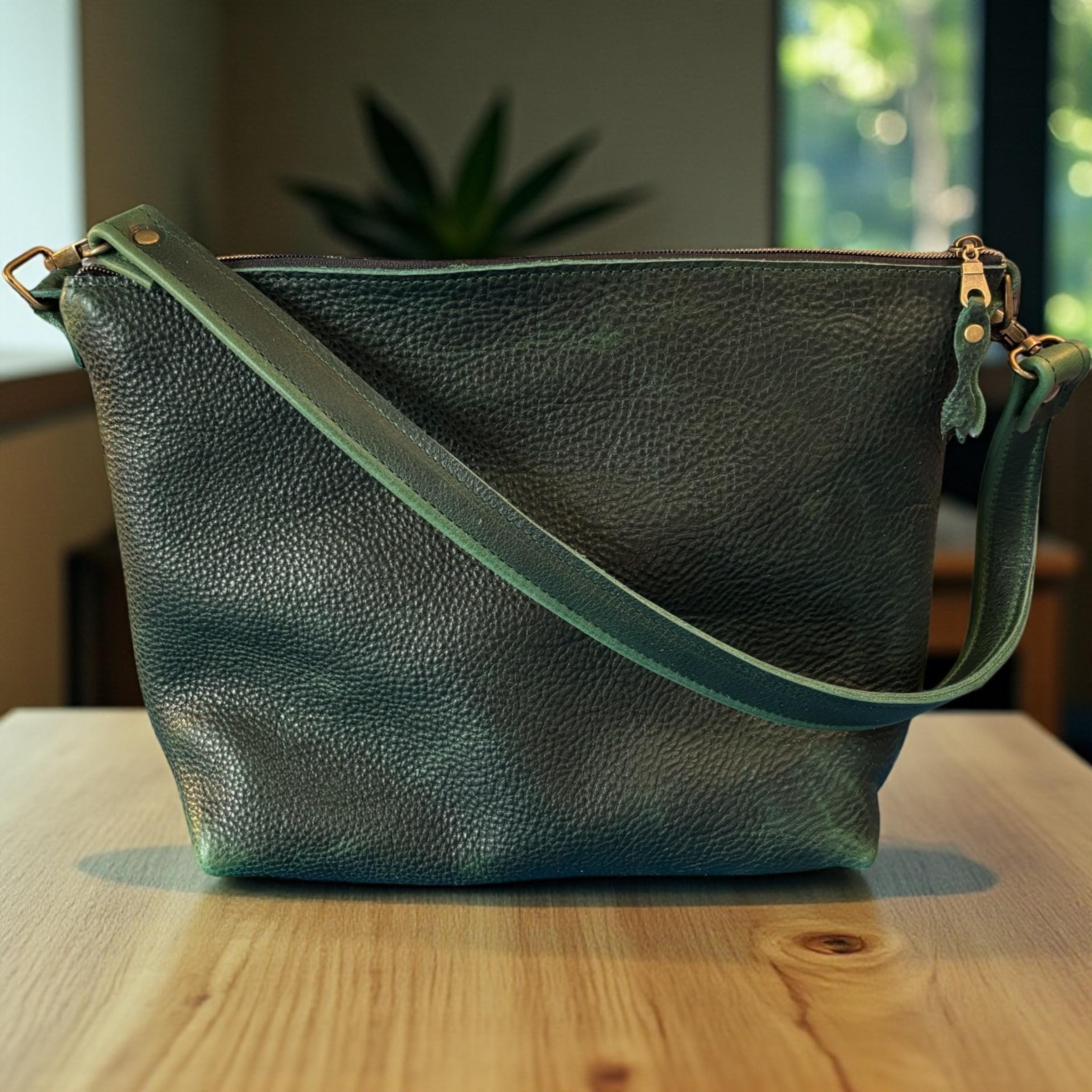 These beautiful Zipper Crossbody or Shoulder Bags/Purses are one of a kind timeless classics. They are all made with 100% full grain leather ranging from 3-5 oz. All exterior seams are double stitched. All come with a detachable shoulder strap making it easy to swap out the shoulder strap for one of your favorite crossbody straps. Outside and inside pockets, Bling Sling or no Bling Sling. It measures approx. 9” tall, approx. 13” wide, approx. 4” depth and the shoulder strap is approx. 1” wide and has an approx. 10” drop.
